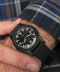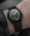 The Baltic x Time+Tide Hermétique Night Mode features a 37mm stainless steel case with a matte black PVD coating, paired with a matte black dial. A polished steel ring punctuates the indices, adding a subtle hit of light that plays well with its double- domed sapphire crystal.